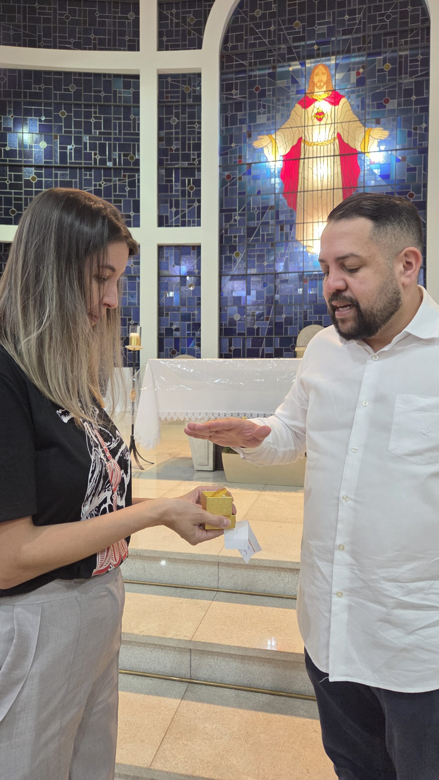 A feliz contemplada foi Paula, que encontrou a medalha com alegria no coração e brilho nos olhos — um momento marcado por fé, emoção e gratidão.
